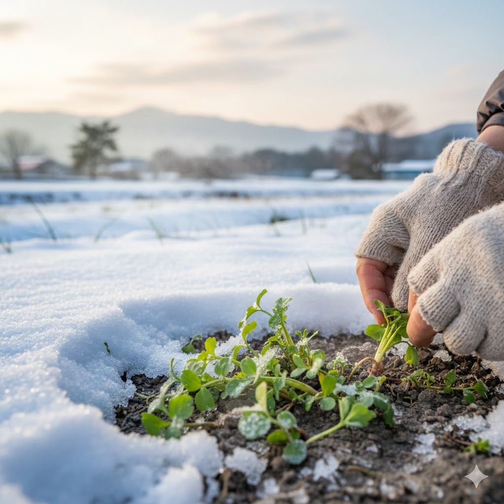 雪溶けの下から生えている野草こそ、春の七草です。実は1月はまだ生えてこないので、売っているのはハウス栽培されている春の七草です。太陰暦(月の暦)の正月は立春の前後の時期になります。